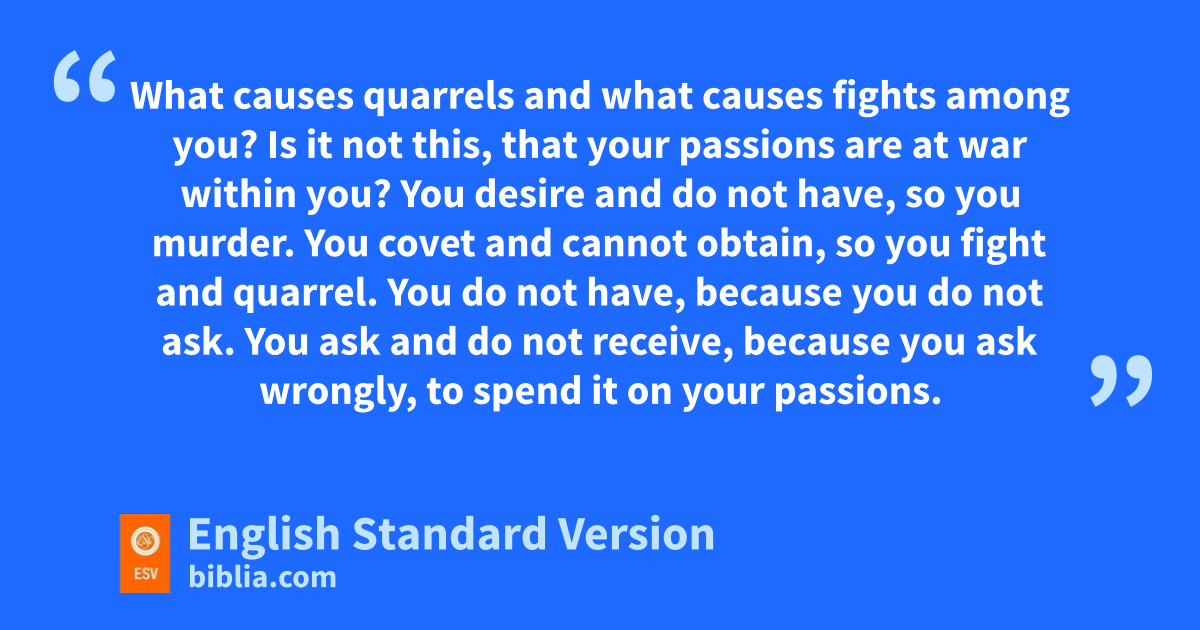 4 What causes quarrels and what causes fights among you? Is it not this, that your passions1 are yat war within you?2 2 You desire and do not have, so you murder. You covet and cannot obtain, so you fight and quarrel. You do not have, because you do not ask. 3 You ask and do not receive, because you ask zwrongly, to spend it on your passions. 4 aYou adulterous people!3 Do you not know that friendship with the world is enmity with God? bTherefore whoever wishes to be a friend of the world makes himself an enemy of God. 5 Or do you suppose it is to no purpose that the Scripture says, “He yearns jealously over the spirit cthat he has made to dwell in us”? 6 But dhe gives more grace. Therefore it says, e“God opposes the proud but dgives grace to the humble.” 7 Submit yourselves therefore to God. fResist the devil, and he will flee from you. 8 gDraw near to God, and he will draw near to you. hCleanse your hands, you sinners, and ipurify your hearts, jyou double-minded. 9 kBe wretched and mourn and weep. Let your laughter be turned to mourning and your joy to gloom. 10 lHumble yourselves before the Lord, and he will exalt you.