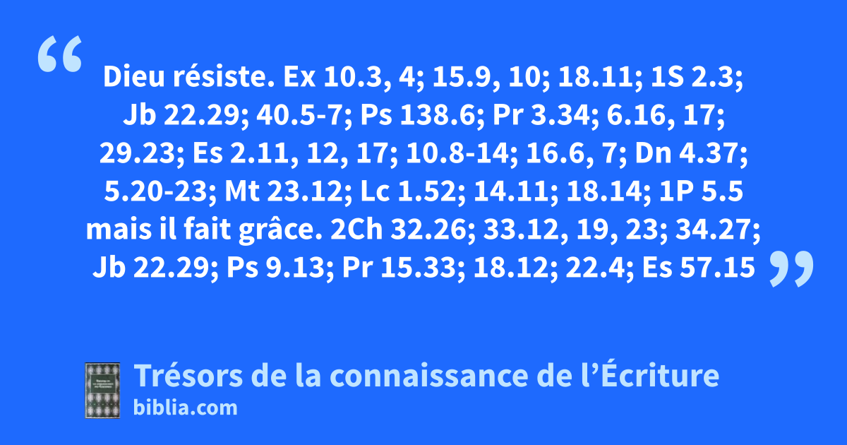Dieu résiste. Ex 10.3, 4; 15.9, 10; 18.11; 1S 2.3; Jb 22.29; 40.5-7; Ps 138.6; Pr 3.34; 6.16, 17; 29.23; Es 2.11, 12, 17; 10.8-14; 16.6, 7; Dn 4.37; 5.20-23; Mt 23.12; Lc 1.52; 14.11; 18.14; 1P 5.5 mais il fait grâce. 2Ch 32.26; 33.12, 19, 23; 34.27; Jb 22.29; Ps 9.13; Pr 15.33; 18.12; 22.4; Es 57.15