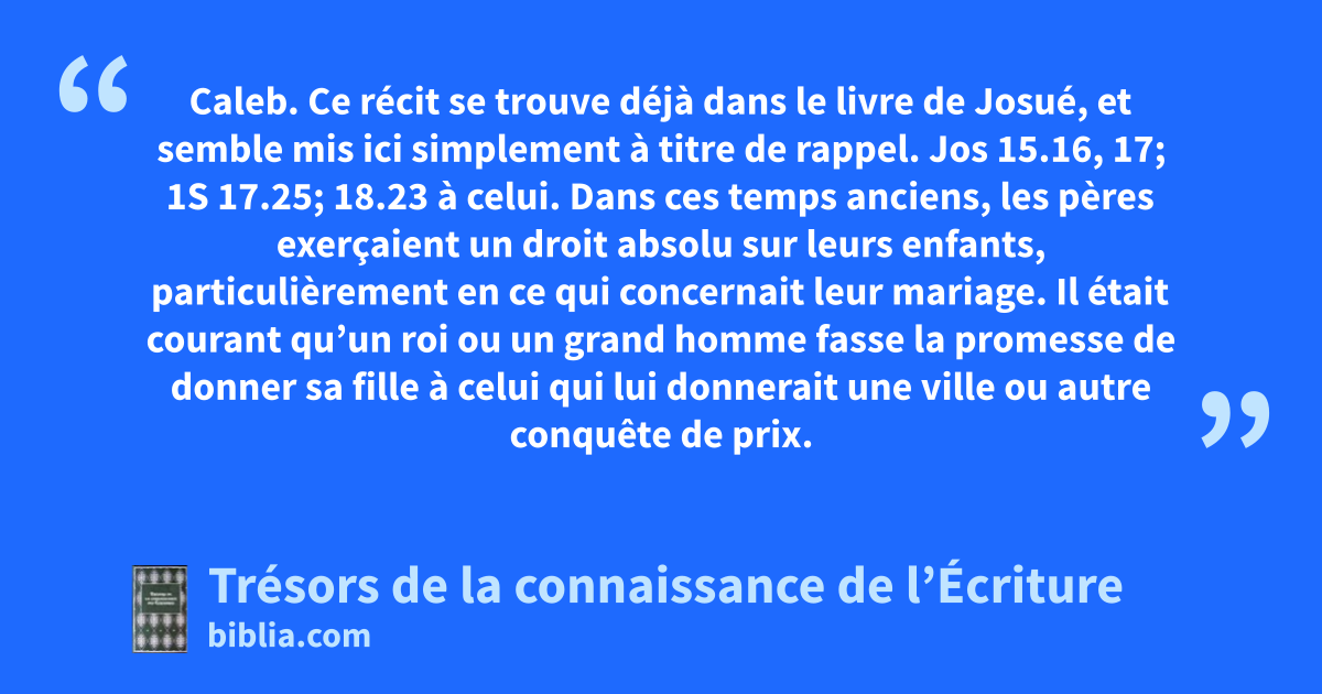 Caleb. Ce récit se trouve déjà dans le livre de Josué, et semble mis ici simplement à titre de rappel. Jos 15.16, 17; 1S 17.25; 18.23 à celui. Dans ces temps anciens, les pères exerçaient un droit absolu sur leurs enfants, particulièrement en ce qui concernait leur mariage. Il était courant qu’un roi ou un grand homme fasse la promesse de donner sa fille à celui qui lui donnerait une ville ou autre conquête de prix.