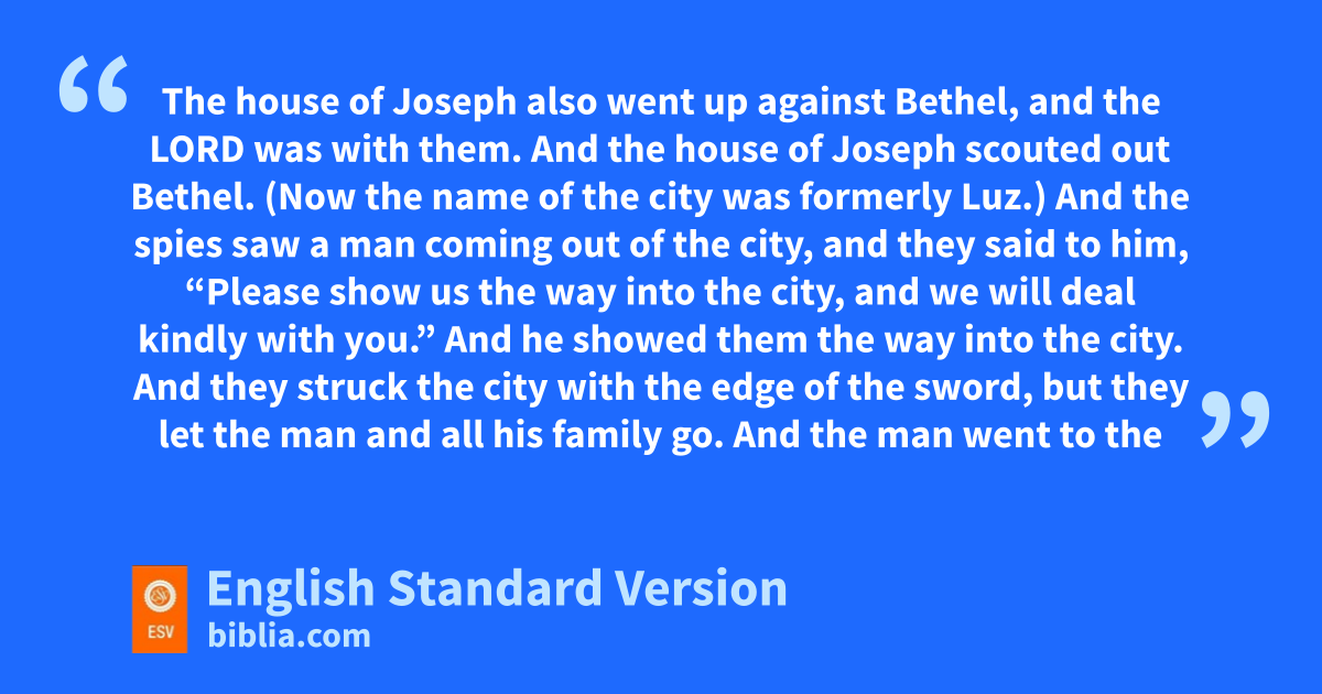 22 The house of Joseph also went up against Bethel, xand the Lord was with them. 23 And the house of Joseph scouted out Bethel. (yNow the name of the city was formerly Luz.) 24 And the spies saw a man coming out of the city, and they said to him, “Please show us the way into the city, zand we will deal kindly with you.” 25 And he showed them the way into the city. And they struck the city with the edge of the sword, but they let the man and all his family go. 26 And the man went to athe land of the Hittites and built a city and called its name Luz. That is its name to this day.