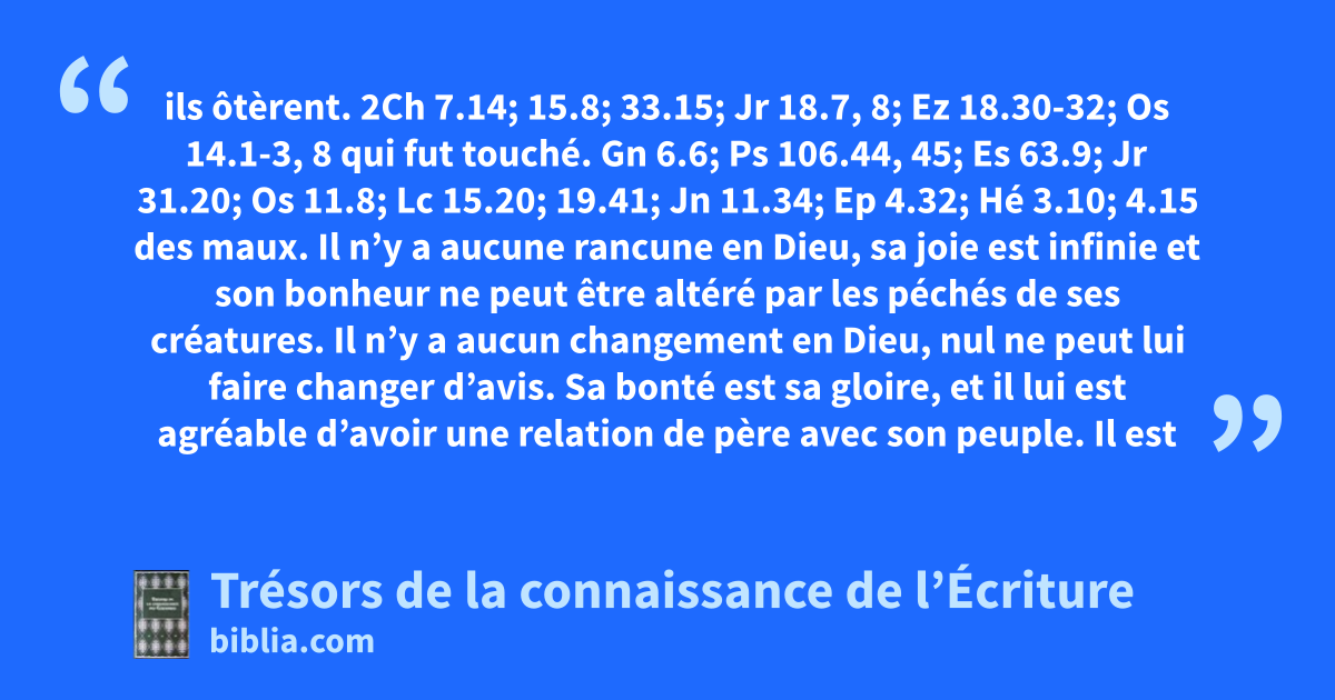 ils ôtèrent. 2Ch 7.14; 15.8; 33.15; Jr 18.7, 8; Ez 18.30-32; Os 14.1-3, 8 qui fut touché. Gn 6.6; Ps 106.44, 45; Es 63.9; Jr 31.20; Os 11.8; Lc 15.20; 19.41; Jn 11.34; Ep 4.32; Hé 3.10; 4.15 des maux. Il n’y a aucune rancune en Dieu, sa joie est infinie et son bonheur ne peut être altéré par les péchés de ses créatures. Il n’y a aucun changement en Dieu, nul ne peut lui faire changer d’avis. Sa bonté est sa gloire, et il lui est agréable d’avoir une relation de père avec son peuple. Il est le Père des lumières, et également le Père des miséricordes.