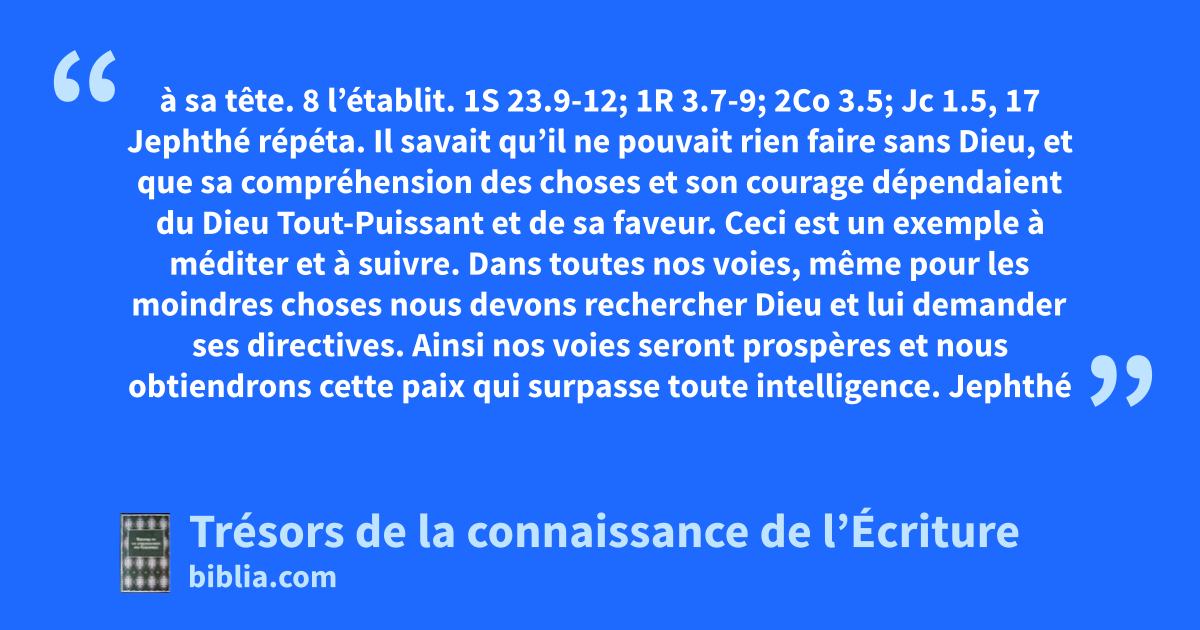 à sa tête. 8 l’établit. 1S 23.9-12; 1R 3.7-9; 2Co 3.5; Jc 1.5, 17 Jephthé répéta. Il savait qu’il ne pouvait rien faire sans Dieu, et que sa compréhension des choses et son courage dépendaient du Dieu Tout-Puissant et de sa faveur. Ceci est un exemple à méditer et à suivre. Dans toutes nos voies, même pour les moindres choses nous devons rechercher Dieu et lui demander ses directives. Ainsi nos voies seront prospères et nous obtiendrons cette paix qui surpasse toute intelligence. Jephthé a ouvert sa campagne par une prière. devant l’Éternel. 10.17; 20.1; 1S 10.17; 11.15 Mitspa. A l’est du Jourdain, dans les montagnes de Galaad, Gn 31.49 et d’ailleurs appelé Mitspé de Galaad un peu plus loin, Jg 11.29 pour le distinguer d’un lieu à l’ouest du Jourdain, dans la tribu de Juda. Jos 15.38