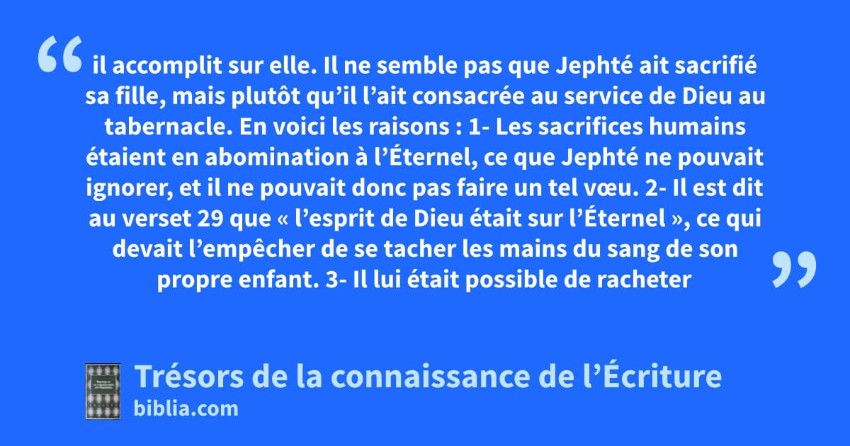 il accomplit sur elle. Il ne semble pas que Jephté ait sacrifié sa fille, mais plutôt qu’il l’ait consacrée au service de Dieu au tabernacle. En voici les raisons : 1- Les sacrifices humains étaient en abomination à l’Éternel, ce que Jephté ne pouvait ignorer, et il ne pouvait donc pas faire un tel vœu. 2- Il est dit au verset 29 que « l’esprit de Dieu était sur l’Éternel », ce qui devait l’empêcher de se tacher les mains du sang de son propre enfant. 3- Il lui était possible de racheter sa fille, Lv 27.4 et il est évident que sa fille valait plus que trente sicles. 4- De plus, qui aurait accompli cet horrible rite ? Ni Jephté lui-même, qui n’était pas sacrificateur, et en qui on ne trouvait pas une brute inhumaine, et les sacrificateurs l’auraient certainement dissuadé. 5- Les historiens de l’écriture sacrée écrivent en réalité : « Elle n’a point connu d’homme, et les filles d’Israël vont chaque année la réconforter et parler avec elle ». 31; Lv 27.28, 29; Dt 12.31; Es 66.3 le vœu qu’il avait fait. 1S 1.11, 22, 24, 28; 2.18 coutume. Ou : ordonnance.