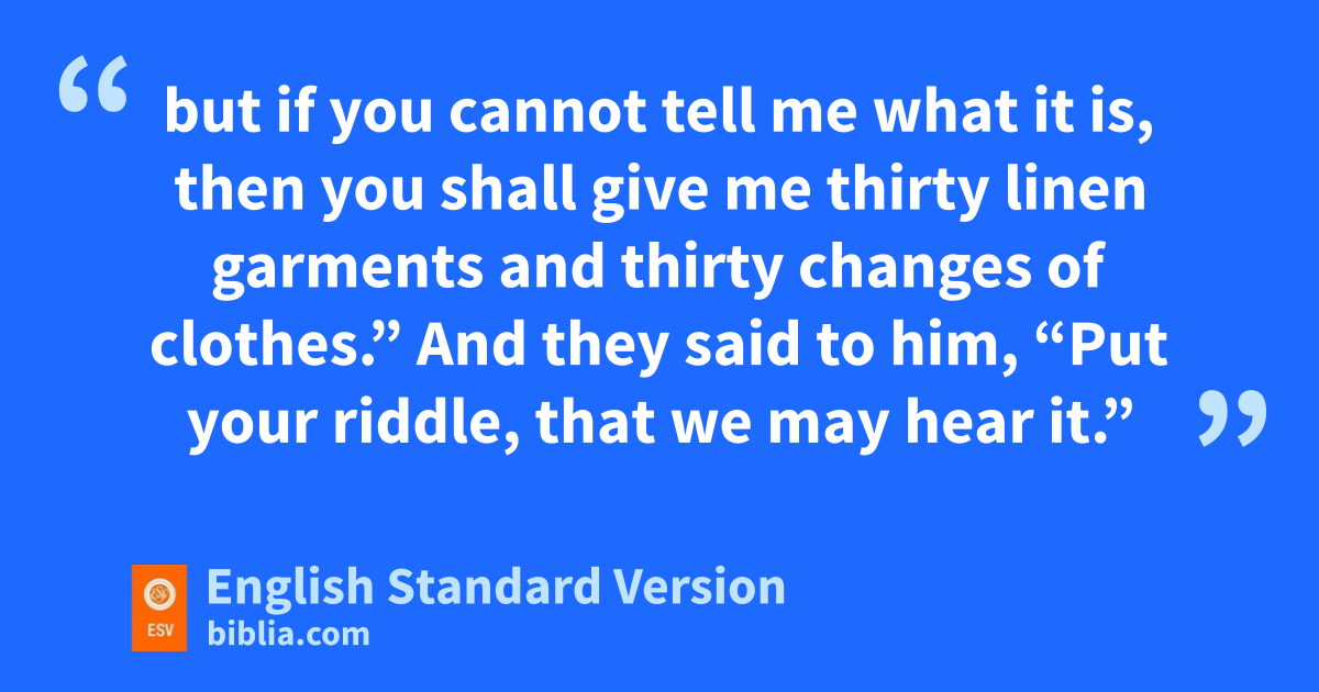 10 His father went down to the woman, and Samson prepared a feast there, for so the young men used to do. 11 As soon as the people saw him, they brought thirty companions to be with him. 12 And Samson said to them, z“Let me now put a riddle to you. If you can tell me what it is, within athe seven days of the feast, and find it out, then I will give you thirty linen garments and thirty bchanges of clothes, 13 but if you cannot tell me what it is, then you shall give me thirty linen garments and thirty changes of clothes.” And they said to him, “Put your riddle, that we may hear it.” 14 And he said to them,