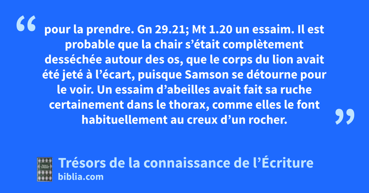pour la prendre. Gn 29.21; Mt 1.20 un essaim. Il est probable que la chair s’était complètement desséchée autour des os, que le corps du lion avait été jeté à l’écart, puisque Samson se détourne pour le voir. Un essaim d’abeilles avait fait sa ruche certainement dans le thorax, comme elles le font habituellement au creux d’un rocher.
