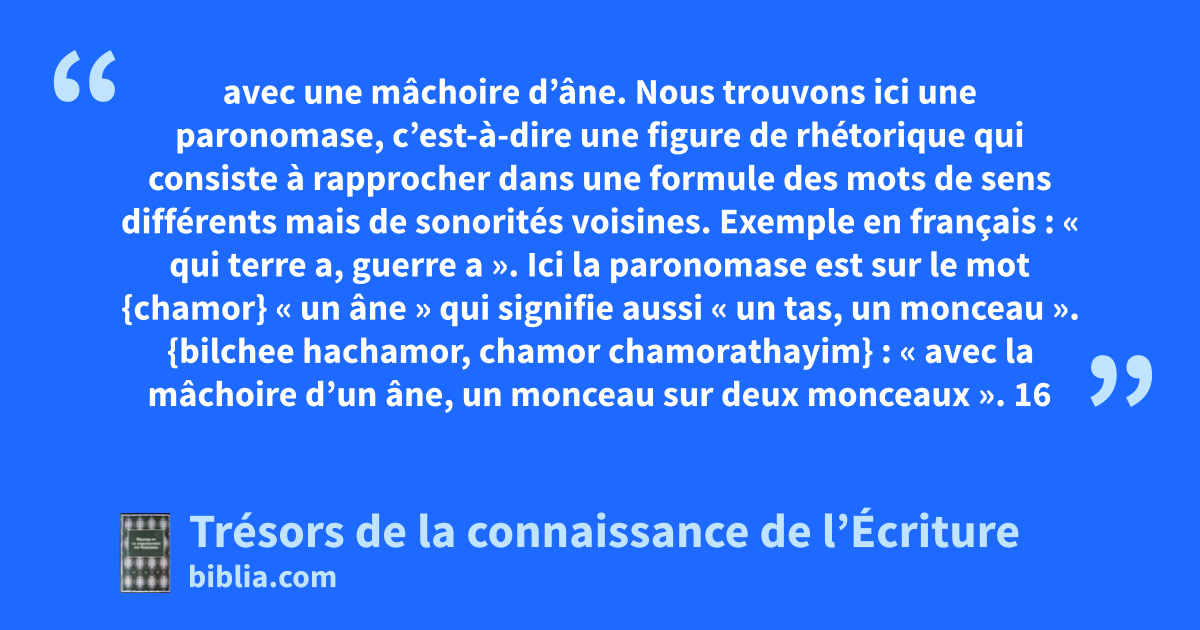avec une mâchoire d’âne. Nous trouvons ici une paronomase, c’est-à-dire une figure de rhétorique qui consiste à rapprocher dans une formule des mots de sens différents mais de sonorités voisines. Exemple en français : « qui terre a, guerre a ». Ici la paronomase est sur le mot {chamor} « un âne » qui signifie aussi « un tas, un monceau ». {bilchee hachamor, chamor chamorathayim} : « avec la mâchoire d’un âne, un monceau sur deux monceaux ». 16