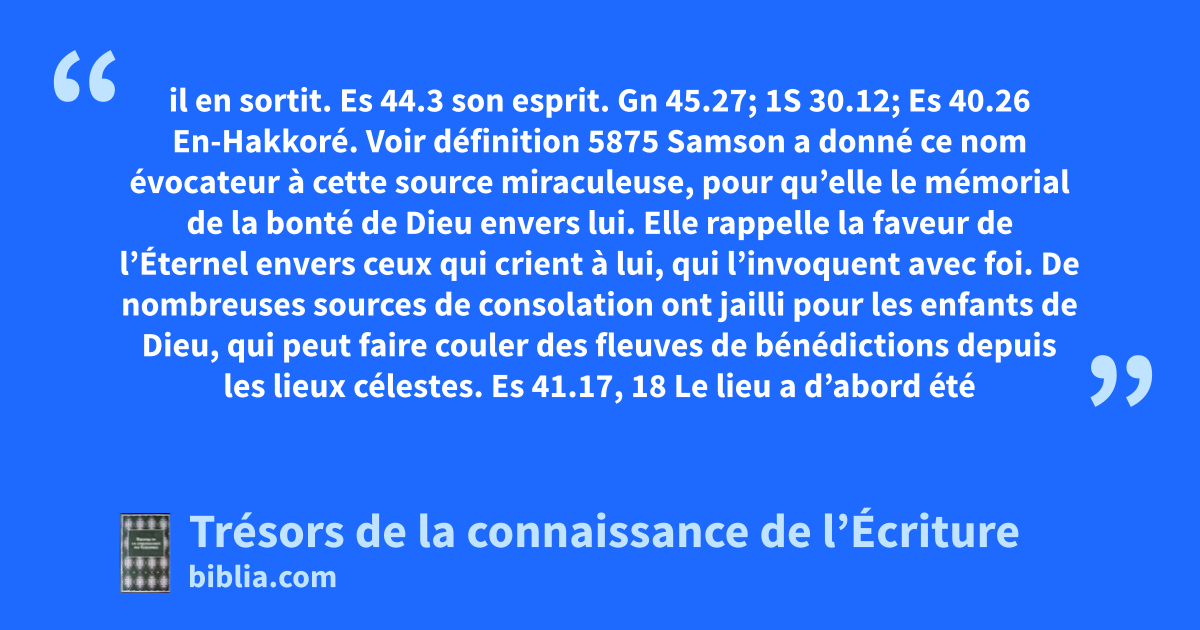 il en sortit. Es 44.3 son esprit. Gn 45.27; 1S 30.12; Es 40.26 En-Hakkoré. Voir définition 5875 Samson a donné ce nom évocateur à cette source miraculeuse, pour qu’elle le mémorial de la bonté de Dieu envers lui. Elle rappelle la faveur de l’Éternel envers ceux qui crient à lui, qui l’invoquent avec foi. De nombreuses sources de consolation ont jailli pour les enfants de Dieu, qui peut faire couler des fleuves de bénédictions depuis les lieux célestes. Es 41.17, 18 Le lieu a d’abord été nommé Ramath-Léchi (la hauteur de la mâchoire) qui montrait la grandeur et le triomphe, puis il est appelé En-Hakkoré, qui rappelle que Samson avait besoin de Dieu, qu’il en était dépendant. Gn 16.13, 22.14; 28.19; 30.30; Ex 17.15; Ps 34.7; 120.1