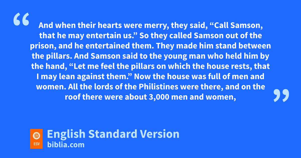 23 Now the lords of the Philistines gathered to offer a great sacrifice to nDagon their god and to rejoice, and they said, “Our god has given Samson our enemy into our hand.” 24 And when the people saw him, othey praised their god. For they said, “Our god has given our enemy into our hand, the ravager of our country, who has killed many of us.”2 25 And pwhen their hearts were merry, they said, “Call Samson, that he may entertain us.” So they called Samson out of the prison, and he entertained them. They made him stand between the pillars. 26 And Samson said to the young man who held him by the hand, “Let me feel the pillars on which the house rests, that I may lean against them.” 27 Now the house was full of men and women. All the lords of the Philistines were there, and qon the roof there were about 3,000 men and women, who looked on while Samson entertained.