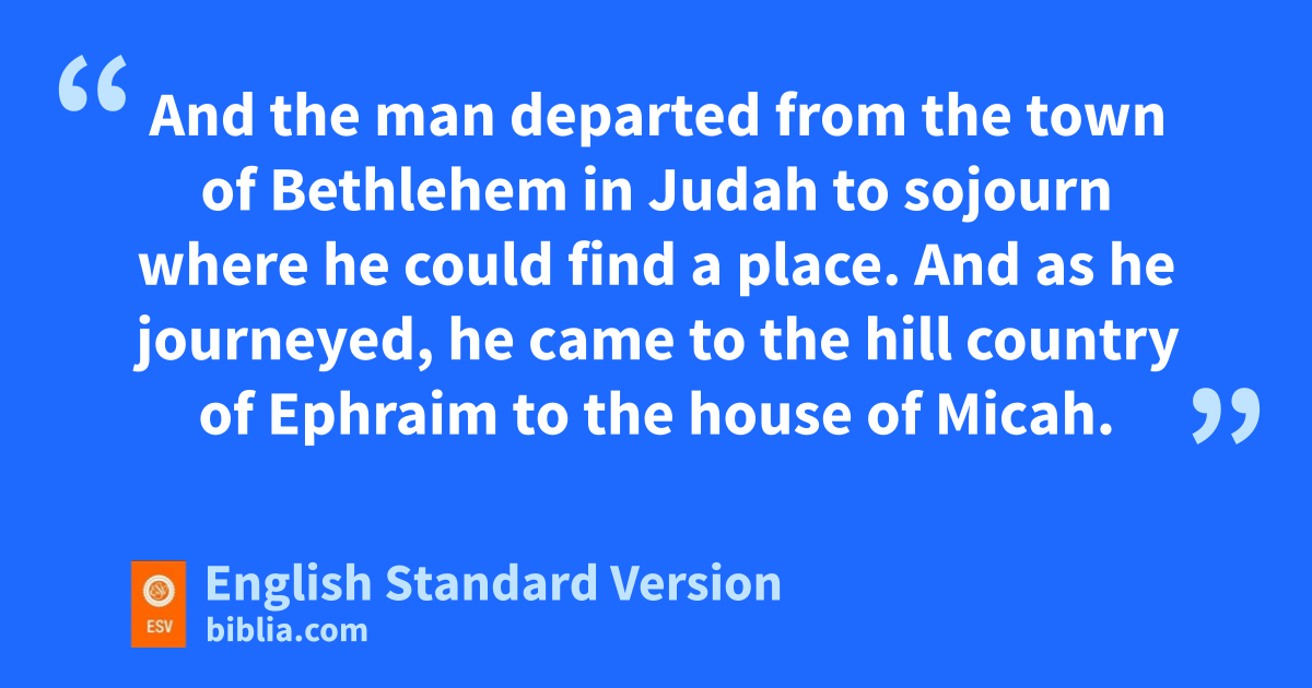 7 Now there was a young man of dBethlehem in Judah, of the family of Judah, who was a Levite, and he sojourned there. 8 And the man departed from the town of Bethlehem in Judah to sojourn where he could find a place. And as he journeyed, he came to ethe hill country of Ephraim to the house of Micah. 9 And Micah said to him, “Where do you come from?” And he said to him, “I am a Levite of Bethlehem in Judah, and I am going to sojourn where I may find a place.” 10 And Micah said to him, “Stay with me, and be to me fa father and a priest, and I will give you ten pieces of silver a year and a suit of clothes and your living.” And the Levite went in. 11 And the Levite gwas content to dwell with the man, and the young man became to him like one of his sons. 12 And Micah hordained the Levite, and the young man ibecame his priest, and was in the house of Micah. 13 Then Micah said, “Now I know that the Lord will prosper me, because I have a Levite as priest.”