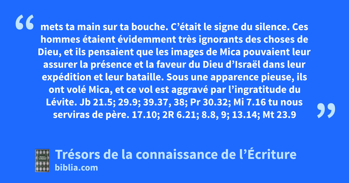 mets ta main sur ta bouche. C’était le signe du silence. Ces hommes étaient évidemment très ignorants des choses de Dieu, et ils pensaient que les images de Mica pouvaient leur assurer la présence et la faveur du Dieu d’Israël dans leur expédition et leur bataille. Sous une apparence pieuse, ils ont volé Mica, et ce vol est aggravé par l’ingratitude du Lévite. Jb 21.5; 29.9; 39.37, 38; Pr 30.32; Mi 7.16 tu nous serviras de père. 17.10; 2R 6.21; 8.8, 9; 13.14; Mt 23.9