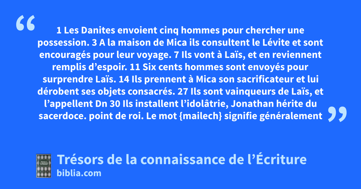 1 Les Danites envoient cinq hommes pour chercher une possession. 3 A la maison de Mica ils consultent le Lévite et sont encouragés pour leur voyage. 7 Ils vont à Laïs, et en reviennent remplis d’espoir. 11 Six cents hommes sont envoyés pour surprendre Laïs. 14 Ils prennent à Mica son sacrificateur et lui dérobent ses objets consacrés. 27 Ils sont vainqueurs de Laïs, et l’appellent Dn 30 Ils installent l’idolâtrie, Jonathan hérite du sacerdoce.