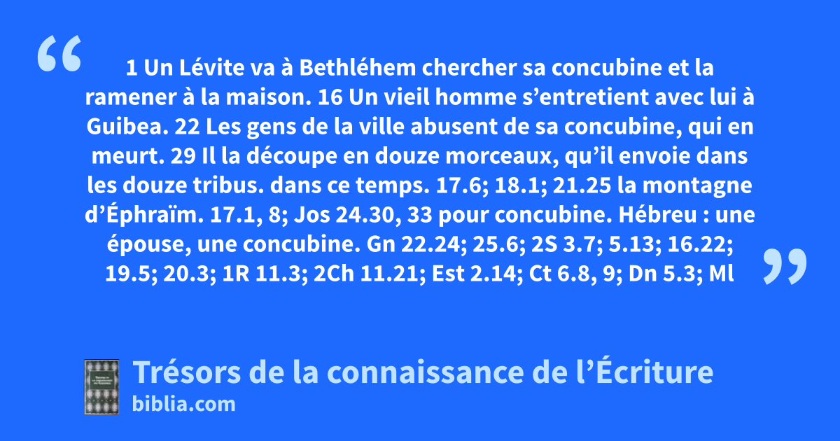 dans ce temps. 17.6; 18.1; 21.25 la montagne d’Éphraïm. 17.1, 8; Jos 24.30, 33 pour concubine. Hébreu : une épouse, une concubine. Gn 22.24; 25.6; 2S 3.7; 5.13; 16.22; 19.5; 20.3; 1R 11.3; 2Ch 11.21; Est 2.14; Ct 6.8, 9; Dn 5.3; Ml 2.15 Bethléhem de Juda. 17.8; Gn 35.19; Mt 2.6