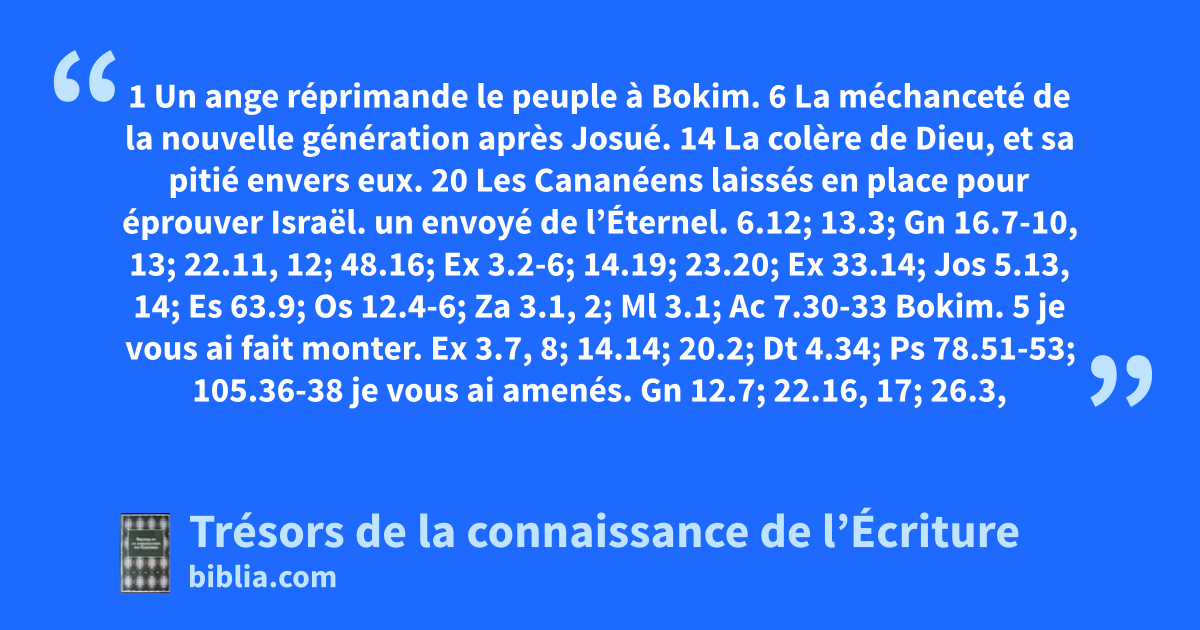 un envoyé de l’Éternel. 6.12; 13.3; Gn 16.7-10, 13; 22.11, 12; 48.16; Ex 3.2-6; 14.19; 23.20; Ex 33.14; Jos 5.13, 14; Es 63.9; Os 12.4-6; Za 3.1, 2; Ml 3.1; Ac 7.30-33 Bokim. 5 je vous ai fait monter. Ex 3.7, 8; 14.14; 20.2; Dt 4.34; Ps 78.51-53; 105.36-38 je vous ai amenés. Gn 12.7; 22.16, 17; 26.3, 4; Jos 3.10; Ps 105.44, 45 jamais je ne romprai. Voir : Gn 17.7, 8; Lv 26.42; Nb 14.34; Ps 89.35; Jr 14.21; 33.20, 21; Za 11.10