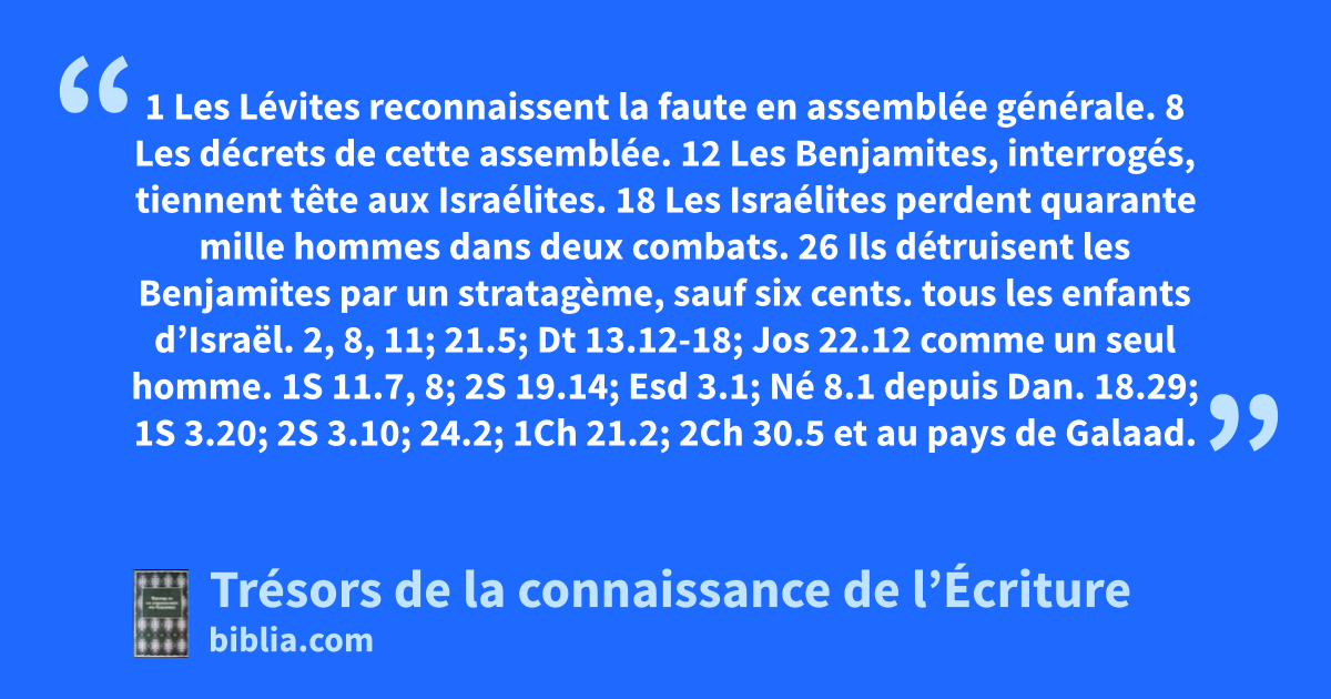 tous les enfants d’Israël. 2, 8, 11; 21.5; Dt 13.12-18; Jos 22.12 comme un seul homme. 1S 11.7, 8; 2S 19.14; Esd 3.1; Né 8.1 depuis Dan. 18.29; 1S 3.20; 2S 3.10; 24.2; 1Ch 21.2; 2Ch 30.5 et au pays de Galaad. Nb 32.1, 40; Jos 17.1; 2S 2.9 l’assemblée. 18, 26; 11.11 à Mitspa. 10.17; 11.11; Jos 15.38; 18.26; 1S 7.5, 6; 10.17; 2R 25.23 Il ne semble pas que les Israélites aient été dirigés à cette occasion par une autorité ou un chef commun, mais ils se sont réunis par libre consentement, d’un même cœur, avec un zèle saint pour l’honneur de Dieu et d’Israël.
