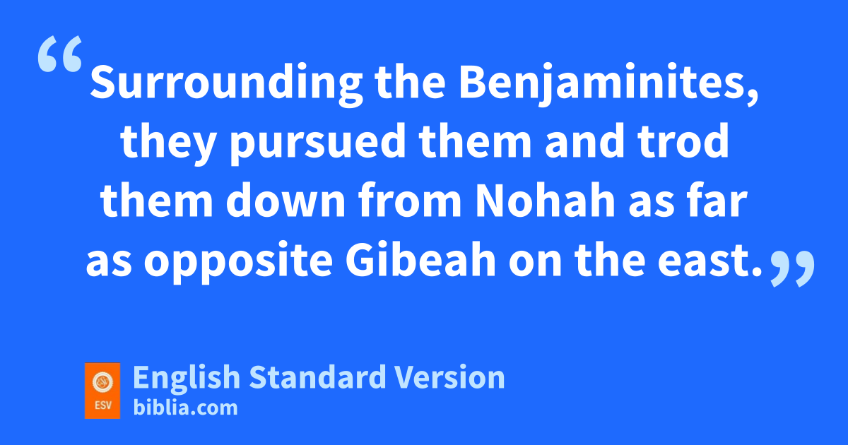 29 ySo Israel set men in ambush around Gibeah. 30 And the people of Israel went up against the people of Benjamin on the third day and set themselves in array against Gibeah, as at other times. 31 And the people of Benjamin went out against the people and were drawn away from the city. And as at other times they began to strike and kill some of the people in the highways, zone of which goes up to aBethel and the other to Gibeah, and in the open country, about thirty men of Israel. 32 And the people of Benjamin said, b“They are routed before us, as at the first.” But the people of Israel said, “Let us flee and draw them away from the city to the highways.” 33 And all the men of Israel rose up out of their place and set themselves in array at Baal-tamar, and the men of Israel who were in ambush rushed out of their place from Maareh-geba.1 34 And there came against Gibeah 10,000 chosen men out of all Israel, and the battle was hard, cbut the Benjaminites did not know that disaster was close upon them. 35 And the Lord defeated Benjamin before Israel, and the people of Israel destroyed 25,100 men of Benjamin that day. All these were men who ddrew the sword. 36 So the people of Benjamin saw that they were defeated.