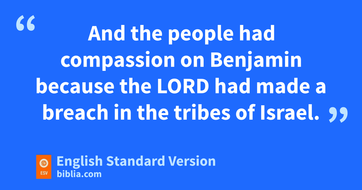 13 Then the whole congregation sent word to the people of Benjamin who were at the urock of Rimmon and vproclaimed peace to them. 14 And Benjamin returned at that time. And they gave them the women whom they had saved alive of the women of Jabesh-gilead, but they were not enough for them. 15 And the people whad compassion on Benjamin because the Lord had made a breach in the tribes of Israel.