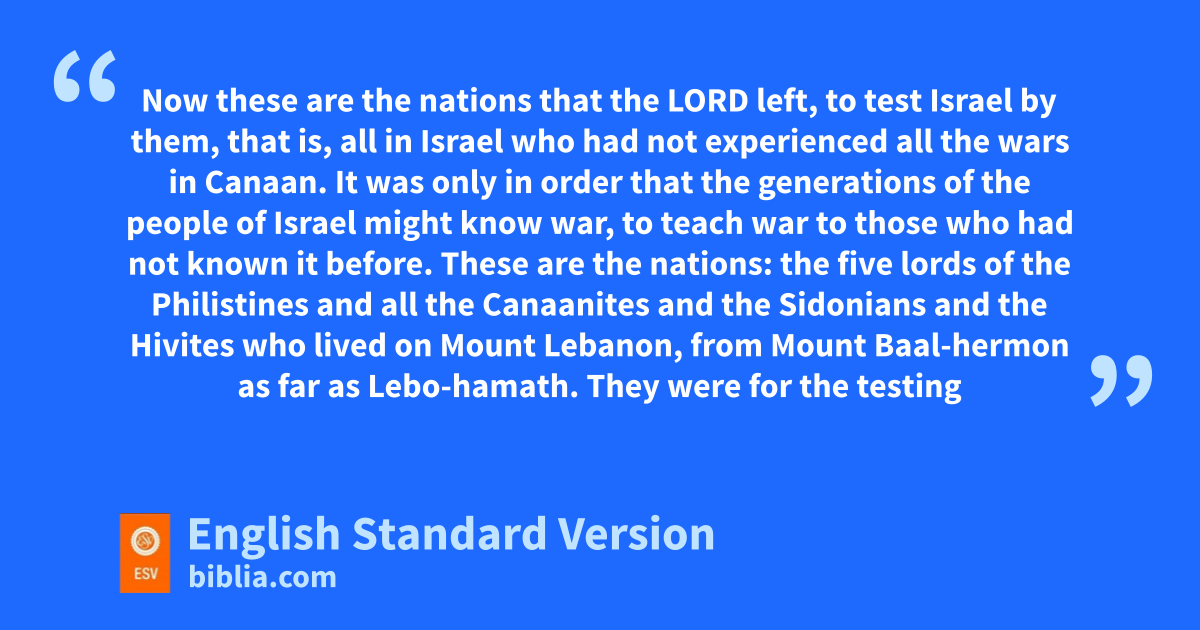 3 pNow these are the nations that the Lord left, to test Israel by them, that is, all in Israel who had not experienced all the wars in Canaan. 2 It was only in order that the generations of the people of Israel might know war, to teach war to those who had not known it before. 3 These are the nations: qthe five lords of the Philistines and all the Canaanites and the Sidonians and the Hivites who lived on Mount Lebanon, from Mount Baal-hermon as far as Lebo-hamath. 4 They were for rthe testing of Israel, to know whether Israel would obey the commandments of the Lord, which he commanded their fathers by the hand of Moses. 5 So the people of Israel lived samong the Canaanites, the Hittites, the Amorites, the Perizzites, the Hivites, and the Jebusites. 6 tAnd their daughters they took to themselves for wives, and their own daughters they gave to their sons, and they served their gods.