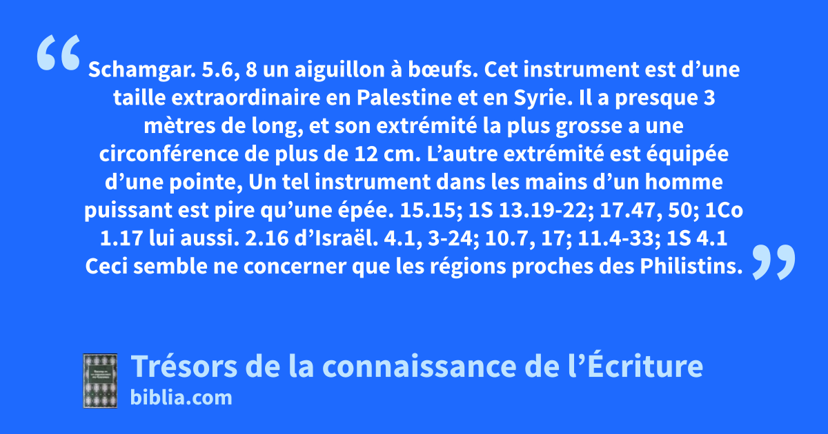 Schamgar. 5.6, 8 un aiguillon à bœufs. Cet instrument est d’une taille extraordinaire en Palestine et en Syrie. Il a presque 3 mètres de long, et son extrémité la plus grosse a une circonférence de plus de 12 cm. L’autre extrémité est équipée d’une pointe, Un tel instrument dans les mains d’un homme puissant est pire qu’une épée. 15.15; 1S 13.19-22; 17.47, 50; 1Co 1.17 lui aussi. 2.16 d’Israël. 4.1, 3-24; 10.7, 17; 11.4-33; 1S 4.1 Ceci semble ne concerner que les régions proches des Philistins.