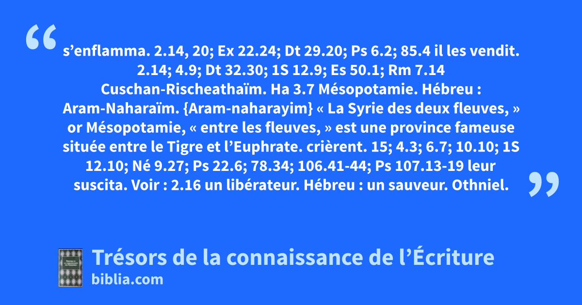 s’enflamma. 2.14, 20; Ex 22.24; Dt 29.20; Ps 6.2; 85.4 il les vendit. 2.14; 4.9; Dt 32.30; 1S 12.9; Es 50.1; Rm 7.14 Cuschan-Rischeathaïm. Ha 3.7 Mésopotamie. Hébreu : Aram-Naharaïm. {Aram-naharayim} « La Syrie des deux fleuves, » or Mésopotamie, « entre les fleuves, » est une province fameuse située entre le Tigre et l’Euphrate.