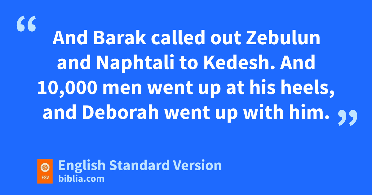 4 Now Deborah, a prophetess, the wife of Lappidoth, was judging Israel at that time. 5 She used to sit under the palm of Deborah between Ramah and Bethel in ethe hill country of Ephraim, and the people of Israel came up to her for judgment. 6 She sent and summoned fBarak the son of Abinoam from gKedesh-naphtali and said to him, “Has not the Lord, the God of Israel, commanded you, ‘Go, gather your men at Mount hTabor, taking 10,000 from the people of Naphtali and the people of Zebulun. 7 And I will draw out Sisera, the general of Jabin’s army, to meet you by ithe river Kishon with his chariots and his troops, jand I will give him into your hand’?” 8 Barak said to her, “If you will go with me, I will go, but if you will not go with me, I will not go.” 9 And she said, “I will surely go with you. Nevertheless, the road on which you are going will not lead to your glory, for the Lord will ksell Sisera into the hand of a woman.” Then Deborah arose and went with Barak to Kedesh. 10 And Barak called out lZebulun and Naphtali to Kedesh. And 10,000 men went up at his heels, and Deborah went up with him.