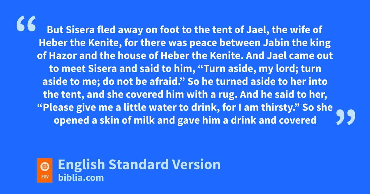 17 But Sisera fled away on foot to the tent of Jael, the wife of Heber the Kenite, for there was peace between Jabin the king of Hazor and the house of Heber the Kenite. 18 And Jael came out to meet Sisera and said to him, “Turn aside, my lord; turn aside to me; do not be afraid.” So he turned aside to her into the tent, and she covered him with a rug. 19 And he said to her, “Please give me a little water to drink, for I am thirsty.” So she opened ta skin of milk and gave him a drink and covered him. 20 And he said to her, “Stand at the opening of the tent, and if any man comes and asks you, ‘Is anyone here?’ say, ‘No.’ ” 21 But Jael the wife of Heber took a tent peg, and took a hammer in her hand. Then she went softly to him and drove the peg into his temple until it went down into the ground while he was lying fast asleep from weariness. So he died. 22 And behold, as Barak was pursuing Sisera, Jael went out to meet him and said to him, “Come, and I will show you the man whom you are seeking.” So he went in to her tent, and there lay Sisera dead, with the tent peg in his temple.