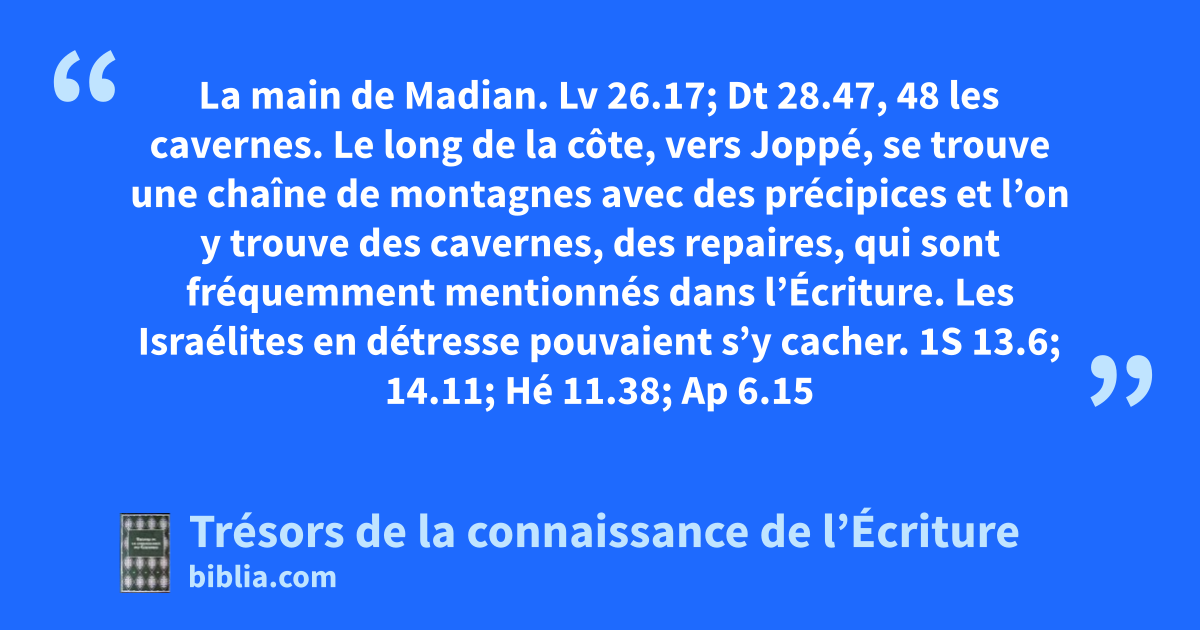 La main de Madian. Lv 26.17; Dt 28.47, 48 les cavernes. Le long de la côte, vers Joppé, se trouve une chaîne de montagnes avec des précipices et l’on y trouve des cavernes, des repaires, qui sont fréquemment mentionnés dans l’Écriture. Les Israélites en détresse pouvaient s’y cacher. 1S 13.6; 14.11; Hé 11.38; Ap 6.15