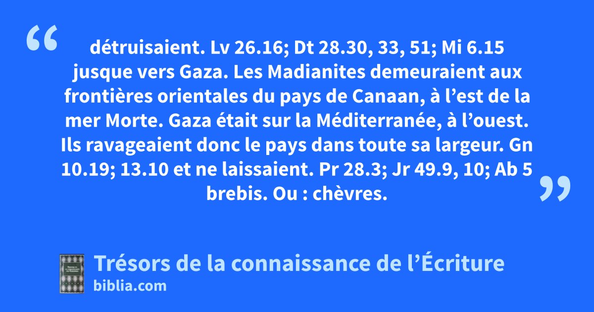 détruisaient. Lv 26.16; Dt 28.30, 33, 51; Mi 6.15 jusque vers Gaza. Les Madianites demeuraient aux frontières orientales du pays de Canaan, à l’est de la mer Morte. Gaza était sur la Méditerranée, à l’ouest. Ils ravageaient donc le pays dans toute sa largeur. Gn 10.19; 13.10 et ne laissaient. Pr 28.3; Jr 49.9, 10; Ab 5 brebis. Ou : chèvres.