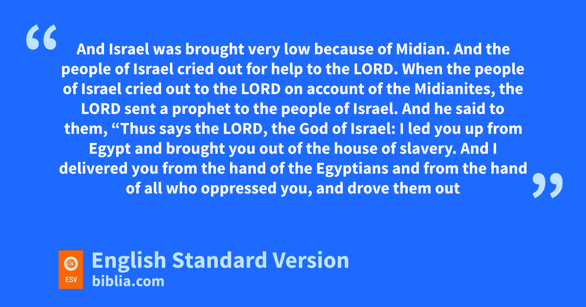 7 When the people of Israel cried out to the Lord on account of the Midianites, 8 the Lord sent a prophet to the people of Israel. And he said to them, “Thus says the Lord, the God of Israel: sI led you up from Egypt and brought you out of the house of slavery. 9 And I delivered you from the hand of the Egyptians and from the hand of all who oppressed you, and tdrove them out before you and gave you their land. 10 And I said to you, ‘I am the Lord your God; uyou shall not fear the gods of the Amorites in whose land you dwell.’ But you have not obeyed my voice.”