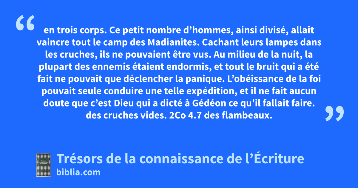 en trois corps. Ce petit nombre d’hommes, ainsi divisé, allait vaincre tout le camp des Madianites. Cachant leurs lampes dans les cruches, ils ne pouvaient être vus. Au milieu de la nuit, la plupart des ennemis étaient endormis, et tout le bruit qui a été fait ne pouvait que déclencher la panique. L’obéissance de la foi pouvait seule conduire une telle expédition, et il ne fait aucun doute que c’est Dieu qui a dicté à Gédéon ce qu’il fallait faire. des cruches vides. 2Co 4.7 des flambeaux. Ou : des lampes, des torches.