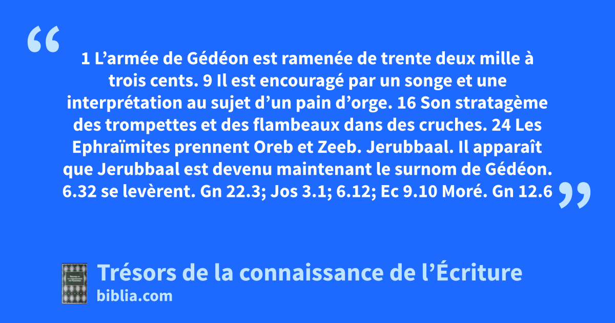 1 L’armée de Gédéon est ramenée de trente deux mille à trois cents. 9 Il est encouragé par un songe et une interprétation au sujet d’un pain d’orge. 16 Son stratagème des trompettes et des flambeaux dans des cruches. 24 Les Ephraïmites prennent Oreb et Zeeb.