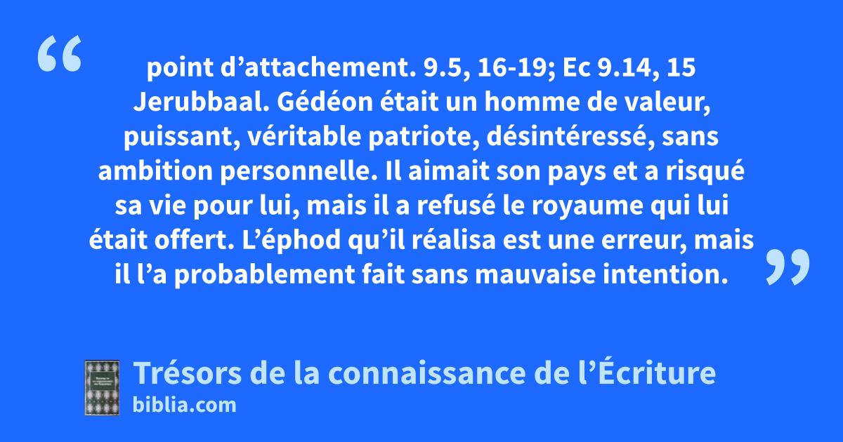 point d’attachement. 9.5, 16-19; Ec 9.14, 15 Jerubbaal. Gédéon était un homme de valeur, puissant, véritable patriote, désintéressé, sans ambition personnelle. Il aimait son pays et a risqué sa vie pour lui, mais il a refusé le royaume qui lui était offert. L’éphod qu’il réalisa est une erreur, mais il l’a probablement fait sans mauvaise intention.