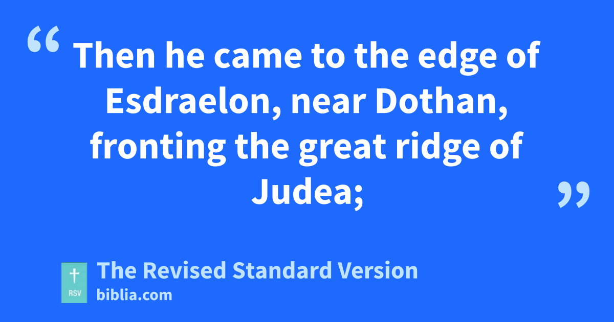 9 Then he came to the edge of Esdraelon, near Dothan, fronting the great ridge of Judea; 10 here he camped between Geba and Scythopolis, and remained for a whole month in order to assemble all the supplies for his army.