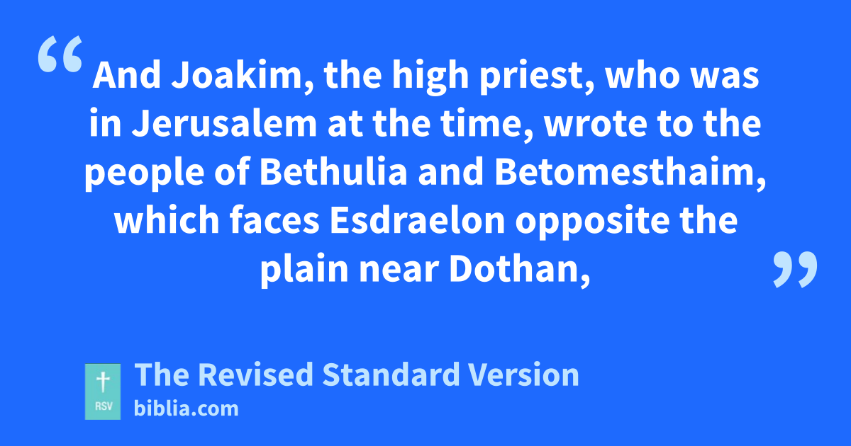 1 By this time the people of Israel living in Judea heard of everything that Holofernes, the general of Nebuchadnezzar the king of the Assyrians, had done to the nations, and how he had plundered and destroyed all their temples; 2 they were therefore very greatly terrified at his approach, and were alarmed both for Jerusalem and for the temple of the Lord their God. 3 For they had only recently returned from the captivity, and all the people of Judea were newly gathered together, and the sacred vessels and the altar and the temple had been consecrated after their profanation. 4 So they sent to every district of Samaria, and to Kona and Beth-horon and Belmain and Jericho and to Choba and Aesora and the valley of Salem, 5 and immediately seized all the high hilltops and fortified the villages on them and stored up food in preparation for war—since their fields had recently been harvested. 6 And Joakim, the high priest, who was in Jerusalem at the time, wrote to the people of Bethulia and Betomesthaim, which faces Esdraelon opposite the plain near Dothan, 7 ordering them to seize the passes up into the hills, since by them Judea could be invaded, and it was easy to stop any who tried to enter, for the approach was narrow, only wide enough for two men at the most.