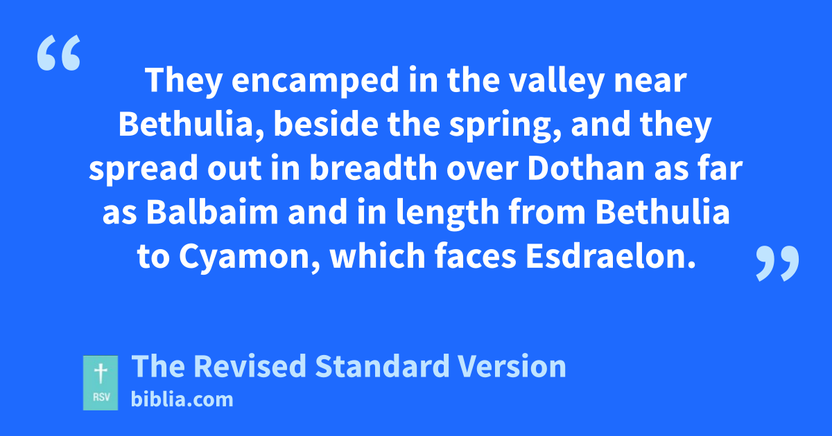 1 The next day Holofernes ordered his whole army, and all the allies who had joined him, to break camp and move against Bethulia, and to seize the passes up into the hill country and make war on the Israelites. 2 So all their warriors moved their camp that day; their force of men of war was one hundred and seventy thousand infantry and twelve thousand cavalry, together with the baggage and the foot soldiers handling it, a very great multitude. 3 They encamped in the valley near Bethulia, beside the spring, and they spread out in breadth over Dothan as far as Balbaim and in length from Bethulia to Cyamon, which faces Esdraelon.