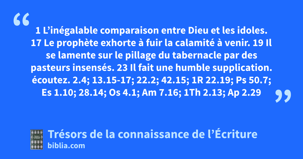 1 L’inégalable comparaison entre Dieu et les idoles. 17 Le prophète exhorte à fuir la calamité à venir. 19 Il se lamente sur le pillage du tabernacle par des pasteurs insensés. 23 Il fait une humble supplication.
