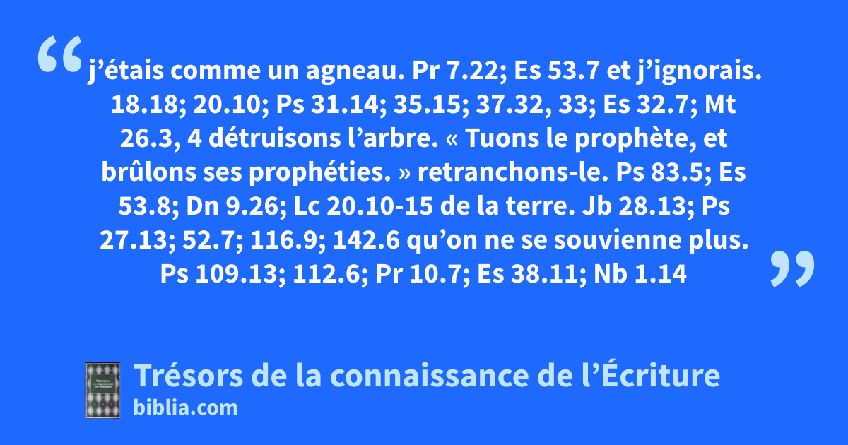 j’étais comme un agneau. Pr 7.22; Es 53.7 et j’ignorais. 18.18; 20.10; Ps 31.14; 35.15; 37.32, 33; Es 32.7; Mt 26.3, 4 détruisons l’arbre. « Tuons le prophète, et brûlons ses prophéties. » retranchons-le. Ps 83.5; Es 53.8; Dn 9.26; Lc 20.10-15 de la terre. Jb 28.13; Ps 27.13; 52.7; 116.9; 142.6 qu’on ne se souvienne plus. Ps 109.13; 112.6; Pr 10.7; Es 38.11; Nb 1.14