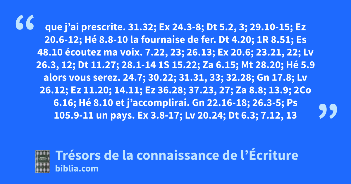 que j’ai prescrite. 31.32; Ex 24.3-8; Dt 5.2, 3; 29.10-15; Ez 20.6-12; Hé 8.8-10 la fournaise de fer. Dt 4.20; 1R 8.51; Es 48.10 écoutez ma voix. 7.22, 23; 26.13; Ex 20.6; 23.21, 22; Lv 26.3, 12; Dt 11.27; 28.1-14 1S 15.22; Za 6.15; Mt 28.20; Hé 5.9 alors vous serez. 24.7; 30.22; 31.31, 33; 32.28; Gn 17.8; Lv 26.12; Ez 11.20; 14.11; Ez 36.28; 37.23, 27; Za 8.8; 13.9; 2Co 6.16; Hé 8.10