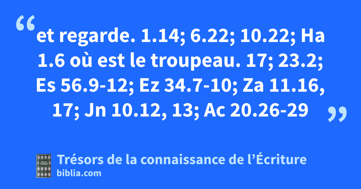 et regarde. 1.14; 6.22; 10.22; Ha 1.6 où est le troupeau. 17; 23.2; Es 56.9-12; Ez 34.7-10; Za 11.16, 17; Jn 10.12, 13; Ac 20.26-29