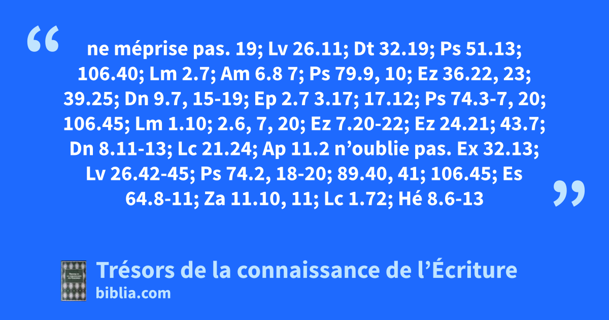 ne méprise pas. 19; Lv 26.11; Dt 32.19; Ps 51.13; 106.40; Lm 2.7; Am 6.8 7; Ps 79.9, 10; Ez 36.22, 23; 39.25; Dn 9.7, 15-19; Ep 2.7 3.17; 17.12; Ps 74.3-7, 20; 106.45; Lm 1.10; 2.6, 7, 20; Ez 7.20-22; Ez 24.21; 43.7; Dn 8.11-13; Lc 21.24; Ap 11.2 n’oublie pas. Ex 32.13; Lv 26.42-45; Ps 74.2, 18-20; 89.40, 41; 106.45; Es 64.8-11; Za 11.10, 11; Lc 1.72; Hé 8.6-13