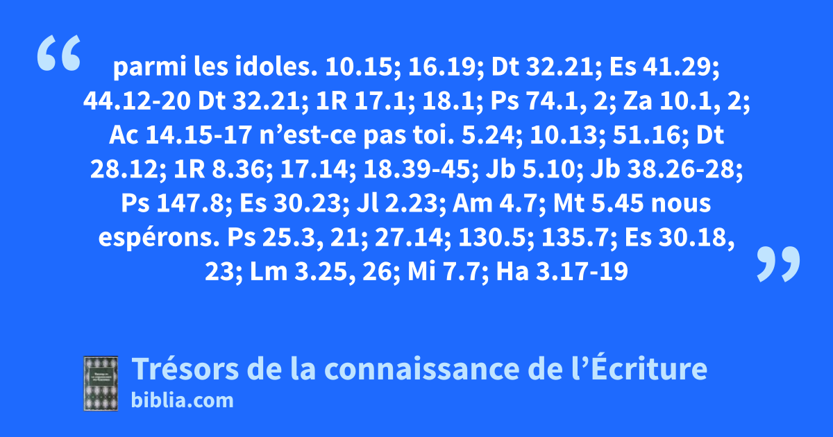 parmi les idoles. 10.15; 16.19; Dt 32.21; Es 41.29; 44.12-20 Dt 32.21; 1R 17.1; 18.1; Ps 74.1, 2; Za 10.1, 2; Ac 14.15-17 n’est-ce pas toi. 5.24; 10.13; 51.16; Dt 28.12; 1R 8.36; 17.14; 18.39-45; Jb 5.10; Jb 38.26-28; Ps 147.8; Es 30.23; Jl 2.23; Am 4.7; Mt 5.45 nous espérons. Ps 25.3, 21; 27.14; 130.5; 135.7; Es 30.18, 23; Lm 3.25, 26; Mi 7.7; Ha 3.17-19