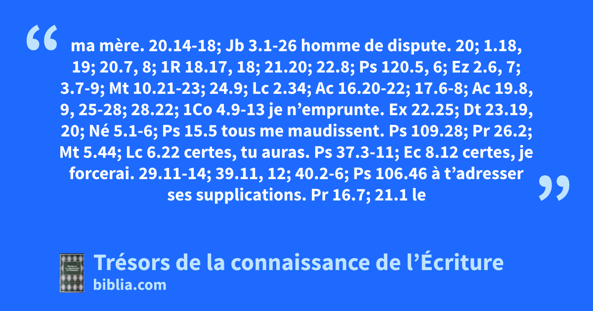 ma mère. 20.14-18; Jb 3.1-26 homme de dispute. 20; 1.18, 19; 20.7, 8; 1R 18.17, 18; 21.20; 22.8; Ps 120.5, 6; Ez 2.6, 7; 3.7-9; Mt 10.21-23; 24.9; Lc 2.34; Ac 16.20-22; 17.6-8; Ac 19.8, 9, 25-28; 28.22; 1Co 4.9-13 je n’emprunte. Ex 22.25; Dt 23.19, 20; Né 5.1-6; Ps 15.5 tous me maudissent. Ps 109.28; Pr 26.2; Mt 5.44; Lc 6.22