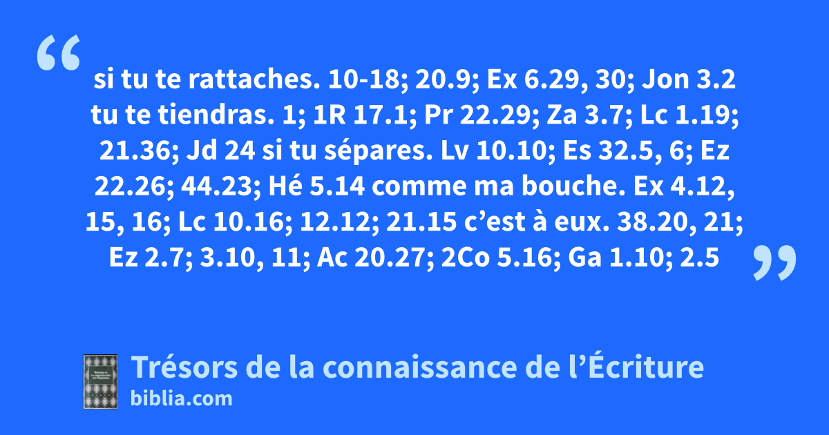 si tu te rattaches. 10-18; 20.9; Ex 6.29, 30; Jon 3.2 tu te tiendras. 1; 1R 17.1; Pr 22.29; Za 3.7; Lc 1.19; 21.36; Jd 24 si tu sépares. Lv 10.10; Es 32.5, 6; Ez 22.26; 44.23; Hé 5.14 comme ma bouche. Ex 4.12, 15, 16; Lc 10.16; 12.12; 21.15 c’est à eux. 38.20, 21; Ez 2.7; 3.10, 11; Ac 20.27; 2Co 5.16; Ga 1.10; 2.5