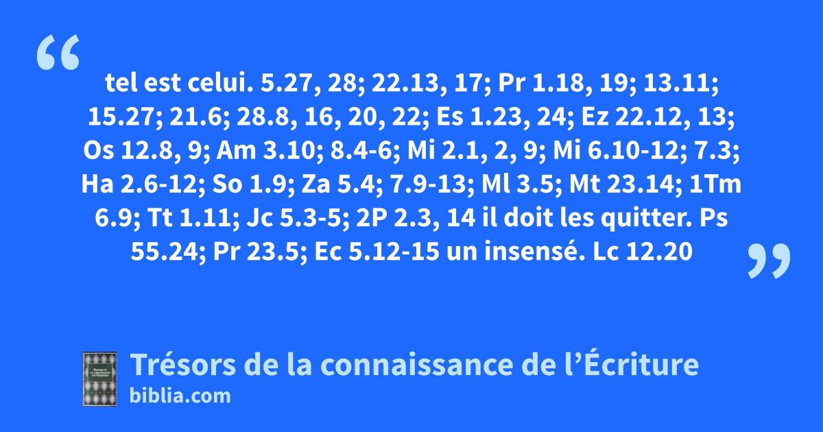 tel est celui. 5.27, 28; 22.13, 17; Pr 1.18, 19; 13.11; 15.27; 21.6; 28.8, 16, 20, 22; Es 1.23, 24; Ez 22.12, 13; Os 12.8, 9; Am 3.10; 8.4-6; Mi 2.1, 2, 9; Mi 6.10-12; 7.3; Ha 2.6-12; So 1.9; Za 5.4; 7.9-13; Ml 3.5; Mt 23.14; 1Tm 6.9; Tt 1.11; Jc 5.3-5; 2P 2.3, 14 il doit les quitter. Ps 55.24; Pr 23.5; Ec 5.12-15 un insensé. Lc 12.20