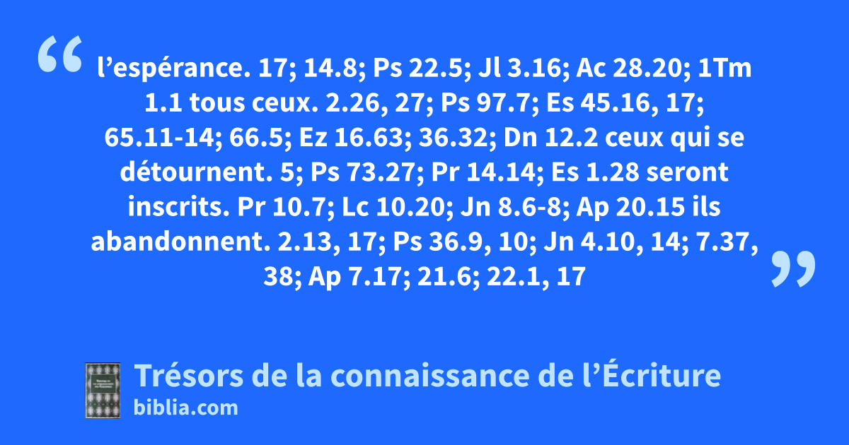 l’espérance. 17; 14.8; Ps 22.5; Jl 3.16; Ac 28.20; 1Tm 1.1 tous ceux. 2.26, 27; Ps 97.7; Es 45.16, 17; 65.11-14; 66.5; Ez 16.63; 36.32; Dn 12.2 ceux qui se détournent. 5; Ps 73.27; Pr 14.14; Es 1.28 seront inscrits. Pr 10.7; Lc 10.20; Jn 8.6-8; Ap 20.15 ils abandonnent. 2.13, 17; Ps 36.9, 10; Jn 4.10, 14; 7.37, 38; Ap 7.17; 21.6; 22.1, 17