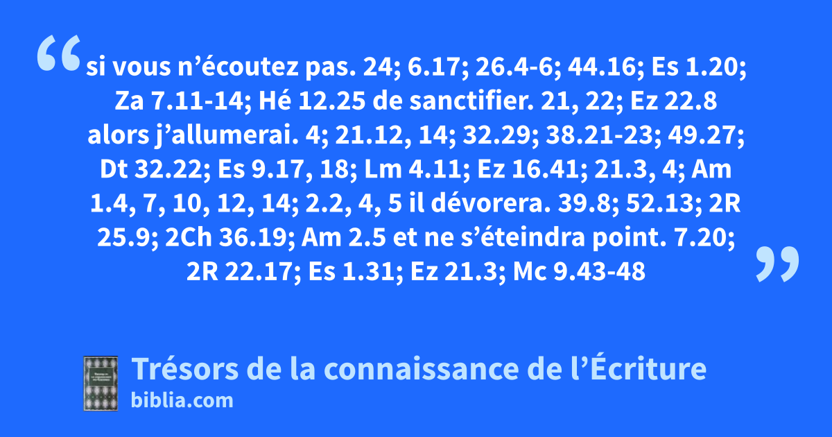 si vous n’écoutez pas. 24; 6.17; 26.4-6; 44.16; Es 1.20; Za 7.11-14; Hé 12.25 de sanctifier. 21, 22; Ez 22.8 alors j’allumerai. 4; 21.12, 14; 32.29; 38.21-23; 49.27; Dt 32.22; Es 9.17, 18; Lm 4.11; Ez 16.41; 21.3, 4; Am 1.4, 7, 10, 12, 14; 2.2, 4, 5 il dévorera. 39.8; 52.13; 2R 25.9; 2Ch 36.19; Am 2.5 et ne s’éteindra point. 7.20; 2R 22.17; Es 1.31; Ez 21.3; Mc 9.43-48