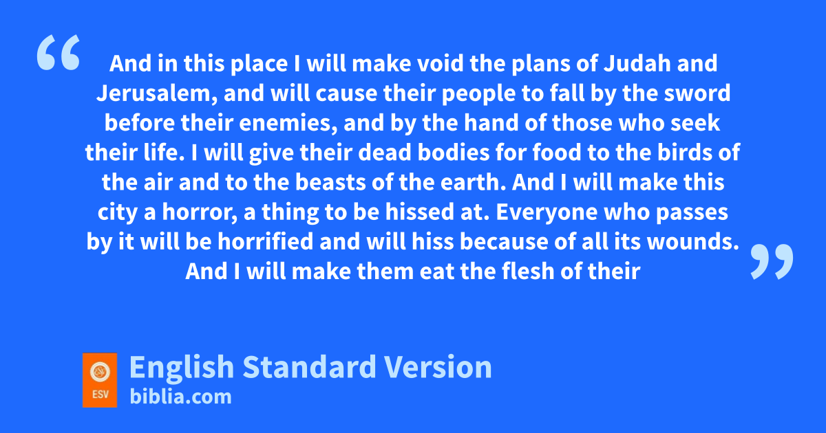 19 Thus says the Lord, “Go, buy ca potter’s earthenware dflask, and take some of ethe elders of the people and some of ethe elders of the priests, 2 and go out fto the Valley of the Son of Hinnom at the entry of the Potsherd Gate, and proclaim there the words that I tell you. 3 You shall say, g‘Hear the word of the Lord, hO kings of Judah and inhabitants of Jerusalem. Thus says the Lord of hosts, the God of Israel: Behold, I am bringing such disaster upon this place that ithe ears of everyone who hears of it will tingle. 4 jBecause the people have forsaken me and have profaned this place by making offerings in it to other gods whom neither they nor their fathers nor the kings of Judah have known; kand because they have filled this place with the blood of innocents, 5 land have built the high places of Baal lto burn their sons in the fire as burnt offerings to Baal, mwhich I did not command or decree, nor did it come into my mind— 6 therefore, nbehold, days are coming, declares the Lord, when this place shall no more be called Topheth, or othe Valley of the Son of Hinnom, but the Valley of Slaughter. 7 And in this place pI will make void the plans of Judah and Jerusalem, qand will cause their people to fall by the sword before their enemies, and by the hand of those who seek their life. rI will give their dead bodies for food to the birds of the air and to the beasts of the earth. 8 And I will make this city sa horror, sa thing to be hissed at. Everyone who passes by it will be horrified and will hiss because of all its wounds. 9 tAnd I will make them eat the flesh of their sons and their daughters, and everyone shall eat the flesh of his neighbor uin the siege and in the distress, with which their enemies and those who seek their life afflict them.’