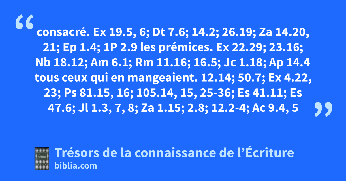 consacré. Ex 19.5, 6; Dt 7.6; 14.2; 26.19; Za 14.20, 21; Ep 1.4; 1P 2.9 les prémices. Ex 22.29; 23.16; Nb 18.12; Am 6.1; Rm 11.16; 16.5; Jc 1.18; Ap 14.4 tous ceux qui en mangeaient. 12.14; 50.7; Ex 4.22, 23; Ps 81.15, 16; 105.14, 15, 25-36; Es 41.11; Es 47.6; Jl 1.3, 7, 8; Za 1.15; 2.8; 12.2-4; Ac 9.4, 5