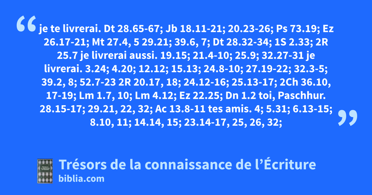 je te livrerai. Dt 28.65-67; Jb 18.11-21; 20.23-26; Ps 73.19; Ez 26.17-21; Mt 27.4, 5 29.21; 39.6, 7; Dt 28.32-34; 1S 2.33; 2R 25.7 je livrerai aussi. 19.15; 21.4-10; 25.9; 32.27-31