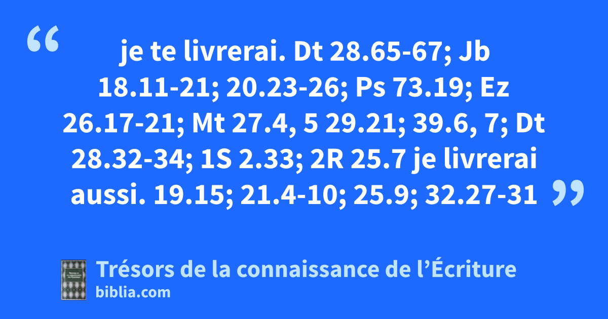 je te livrerai. Dt 28.65-67; Jb 18.11-21; 20.23-26; Ps 73.19; Ez 26.17-21; Mt 27.4, 5 29.21; 39.6, 7; Dt 28.32-34; 1S 2.33; 2R 25.7 je livrerai aussi. 19.15; 21.4-10; 25.9; 32.27-31