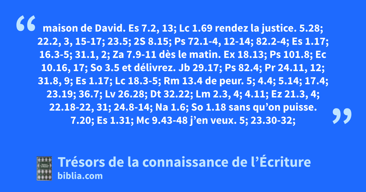 maison de David. Es 7.2, 13; Lc 1.69 rendez la justice. 5.28; 22.2, 3, 15-17; 23.5; 2S 8.15; Ps 72.1-4, 12-14; 82.2-4; Es 1.17; 16.3-5; 31.1, 2; Za 7.9-11 dès le matin. Ex 18.13; Ps 101.8; Ec 10.16, 17; So 3.5 et délivrez. Jb 29.17; Ps 82.4; Pr 24.11, 12; 31.8, 9; Es 1.17; Lc 18.3-5; Rm 13.4 de peur. 5; 4.4; 5.14; 17.4; 23.19; 36.7; Lv 26.28; Dt 32.22; Lm 2.3, 4; 4.11; Ez 21.3, 4; 22.18-22, 31; 24.8-14; Na 1.6; So 1.18 sans qu’on puisse. 7.20; Es 1.31; Mc 9.43-48